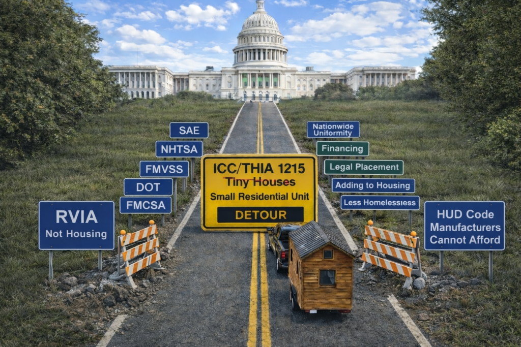 ICC/THIA 1215 selectively relies on HUD Code provisions while avoiding full federal applicability, advances a state-triggered exemption theory under 24 CFR 3282.12 that conflicts with the structure of federal preemption under 24 CFR 3282.11, and supports transportation omissions that make Federal Motor Vehicle Safety Standards inoperable in practice. It further introduces a non-recognized Small Residential Unit framework that forces tiny houses to lose established ground and start over outside recognized statues, financing, titling, and enforcement systems.