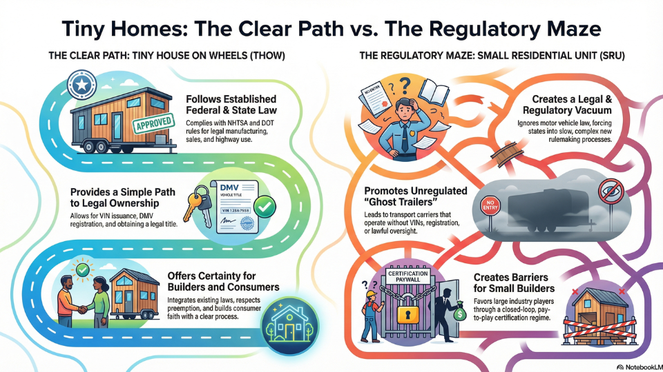 Diverting a tiny house on wheels with an integrated chassis into the Small Residential Unit path does not create clarity or safety—it creates a complex, fragmented, and delayed regulatory maze. Instead of relying on an existing, integrated federal and state compliance framework, the Small Residential Unit forces states and local jurisdictions to rebuild authority from the ground up through administrative rules or legislation, often limited to fixed adoption cycles. Because the Small Residential Unit disregards motor vehicle law and federal preemption, there is no clear, uniform, or immediate path to recognition, approval, reciprocity, or lawful placement. Authorities having jurisdiction are left without enforceable guidance, states are compelled to start from scratch, and legal placement is stalled or denied—not due to any failure in safety, but due to the absence of lawful recognition.