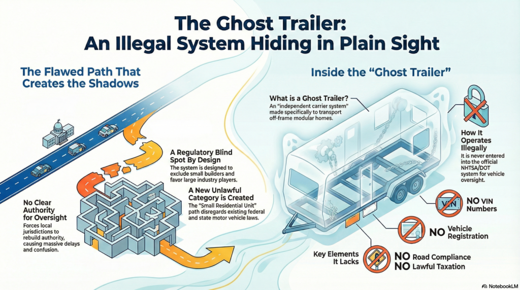 At the end of this regulatory detour is the creation and normalization of what can only be described as a ghost trailer. Through ICC 1215, on behalf of ICC NTA and with the full complicity of the International Code Council, a so-called “independent carrier system” is being promoted that is never placed into the NHTSA/DOT system. This carrier is manufactured for the express purpose of transporting off-frame modular homes, yet operates without vehicle registration, without vehicle identification numbers, without road compliance, without taxation, and without lawful oversight—while falsely characterized as “incidental use” despite a manufacturing purpose that has existed for decades.