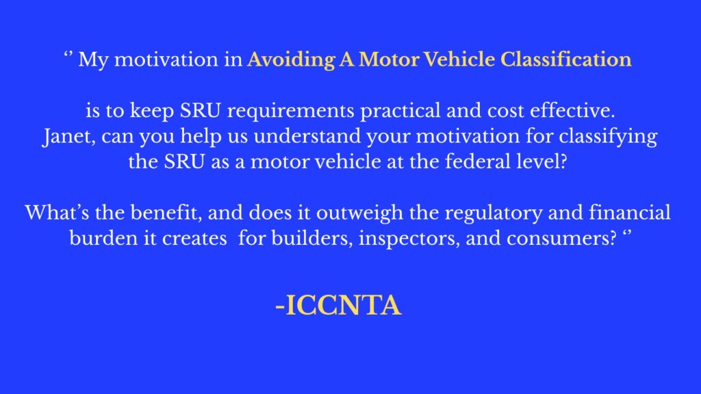 My answer- federal laws trump codes and standards, it is NOT that I want an SRU to be classified as a motor vehicle, it is the path to compliance for trailers. I have simply pointed out the laws-which they want to ignore.